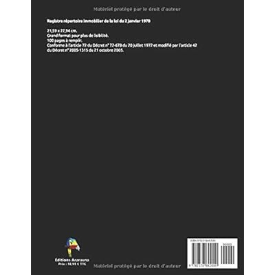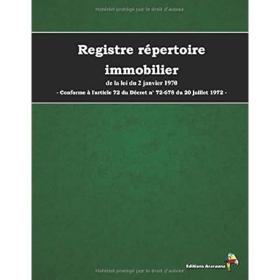 Registre répertoire immobilier de la loi du 2 janvier 197021,59 x 27,94 cm.Grand format pour plus de lisibilité.100 pages à remplir.Conforme à l'article 72 du Décret n° 72-678 du 20 juillet 1972 et modifié par l'article 42 du Décret n° 2005-1315 du 21 octobre 2005.